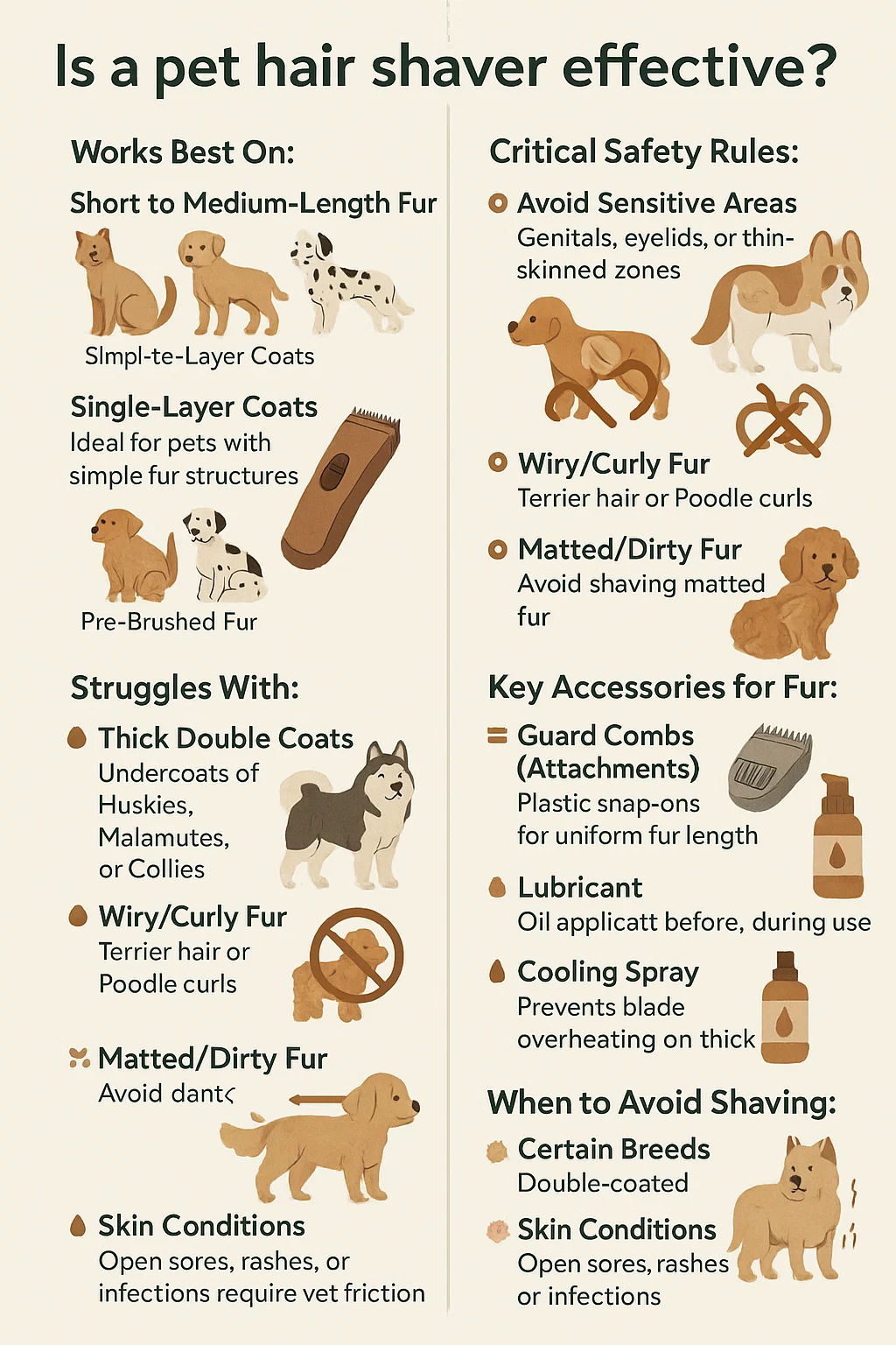Thick Double Coats: Undercoats of Huskies, Malamutes, or Collies may require high-power professional clippers. Home shavers can overheat.